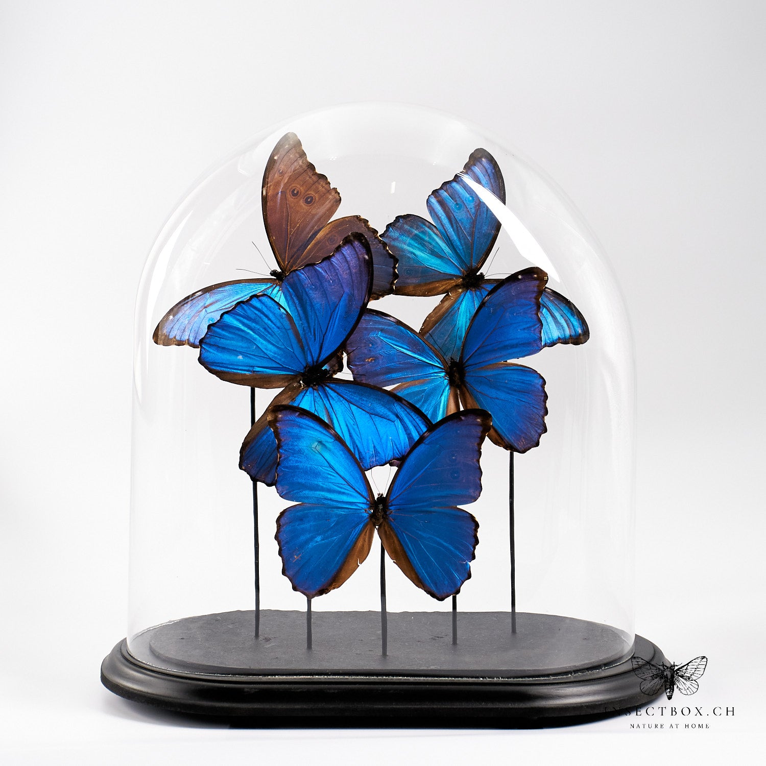 Antique glass bell jar with prepared butterflies - Morpho didius