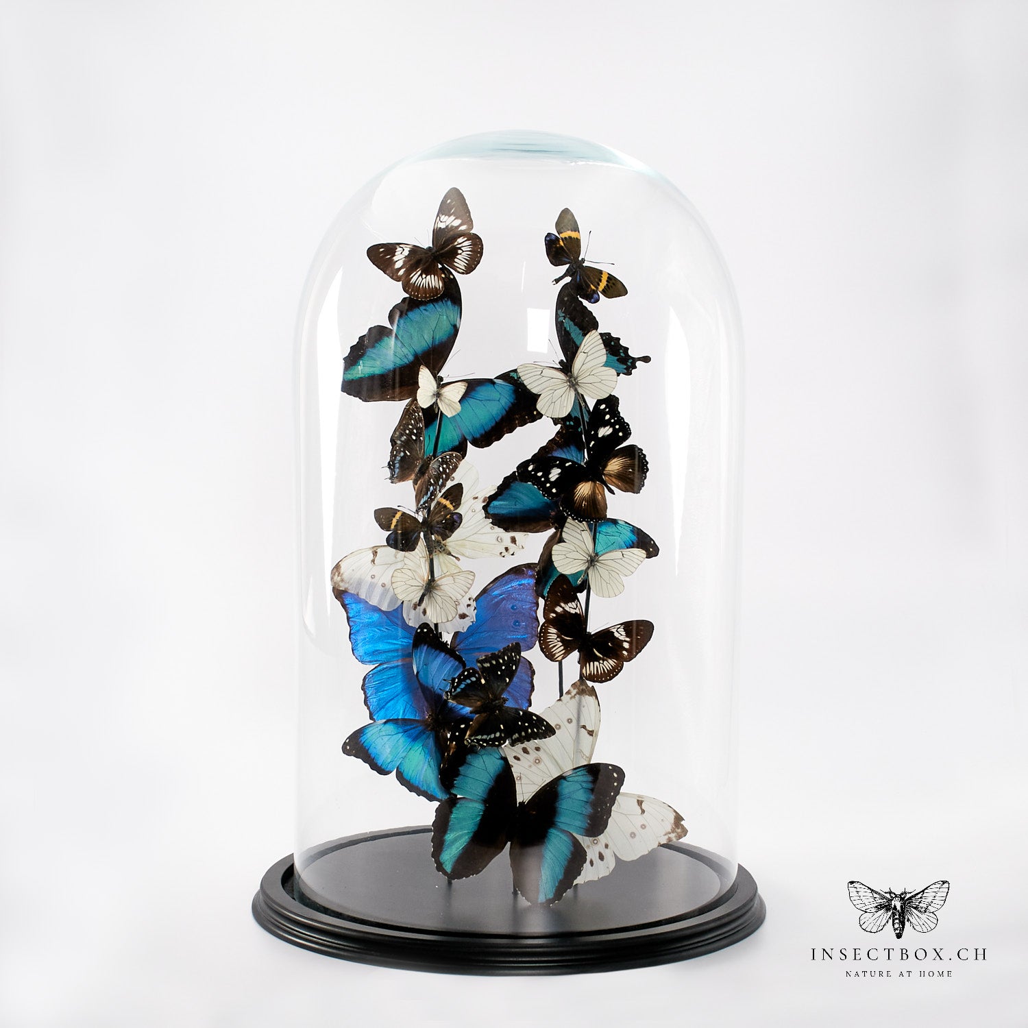Immerse yourself in the fascinating world of butterflies with our exquisite glass bell jar, artfully arranged by our award-winning Dutch taxidermists. These unique works showcase a stunning array of butterflies, including Morpho Menelaus, Ulysess Ulysess, Morpho Deidamia, Morpho Luna, and many more. Each butterfly has been carefully selected and arranged in a harmonious composition to create an impressive visual experience.