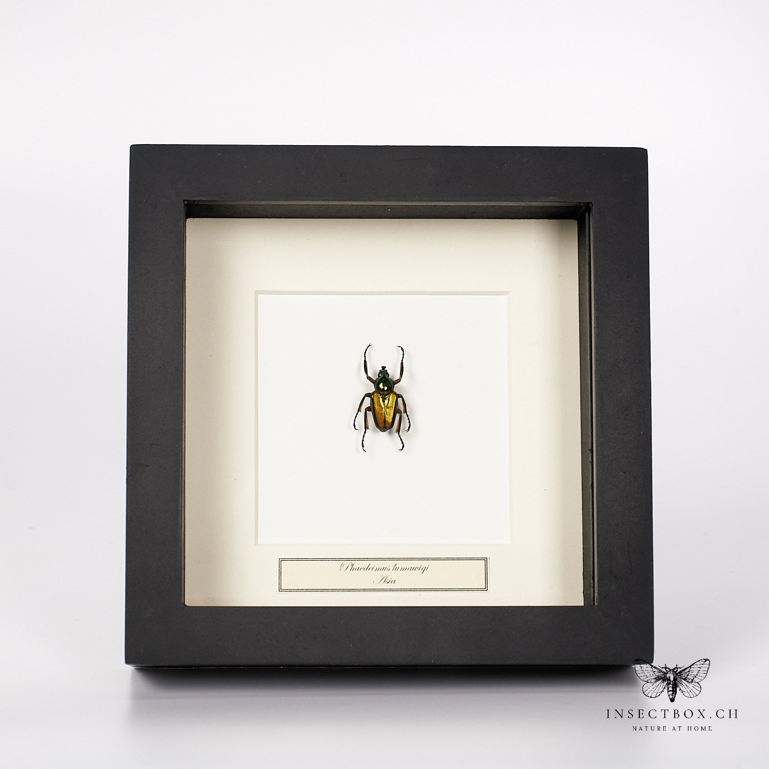 Medium-sized (preferably 20-25 millimeters), slightly elongated, metallic-colored golden perch. The males have horn-like outgrowths on both the head and pronotum, which can be quite long in some species and converge towards each other, forming a pinch formation. The pronotum is very shiny, greenish-metallic. The elytra have a black lateral stripe and are more copper-colored. The legs, especially the front legs of the males, are quite long and slender.
