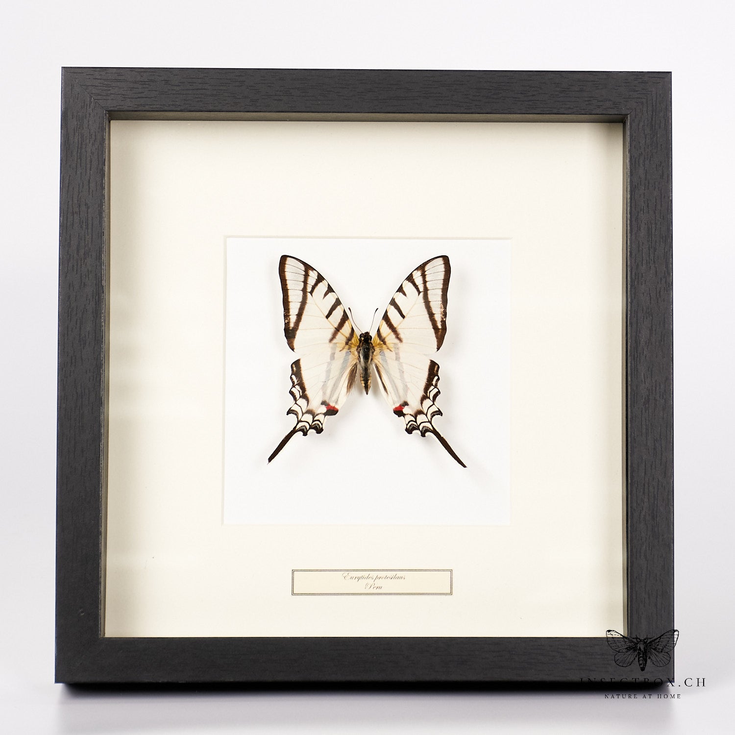Appearance: Eurytides protesilaus is characterized by its characteristic long tail extensions on the hind wings, which are typical of many swallowtail species. The basic color of the wings is predominantly white with black markings.